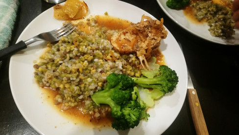 Puis faire des courses, et ensuite faire des crêpes encore pour finir la farine, et préparer le repas (poulet au citron et épices, mélange de graines et céréales façon risotto, brocolis, salade (car « qui mange de la salade n’est jamais malade » dicton de tata Maud)