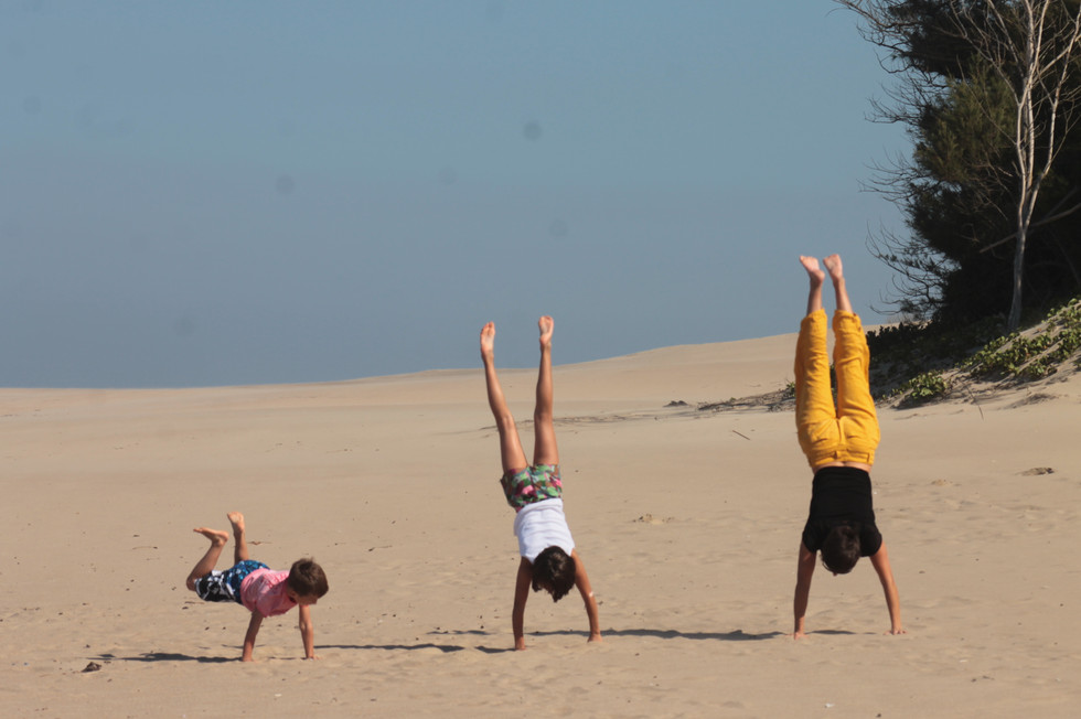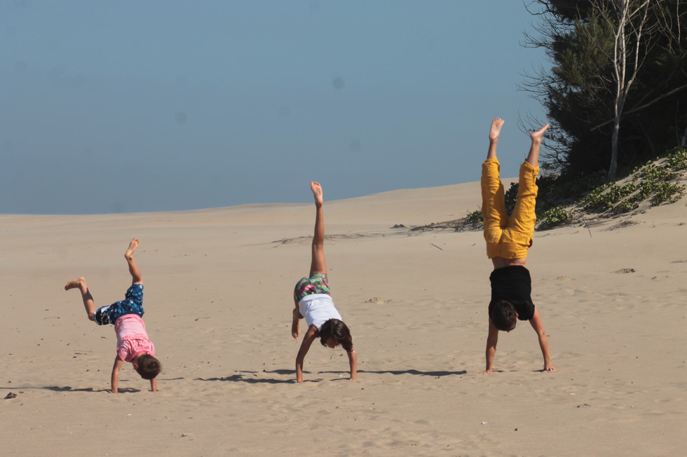On roule jusqu’à la plage du cape vidal où on nous a dit qu’on pouvait se baigner. C’est une plage immense avec une mer très mouvementée, mais à marée basse il y a des rochers qui forment des piscines et les enfants ont pu se baigner. L’eau doit être à 24° et l’air à 28°.