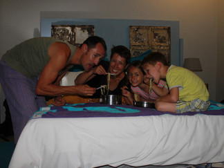 Ce soir c'est nodule party dans la chambre, ce n'est pas super bon mais c'est pas cher et facile à faire sur le réchaud de camping dans la chambre???? C'est pas déçue non plus et les enfants adorent évidemment ... Avec de bonnes saucisses sèches de boeuf et d'autruche....On aura bien ris en tout cas.!!!