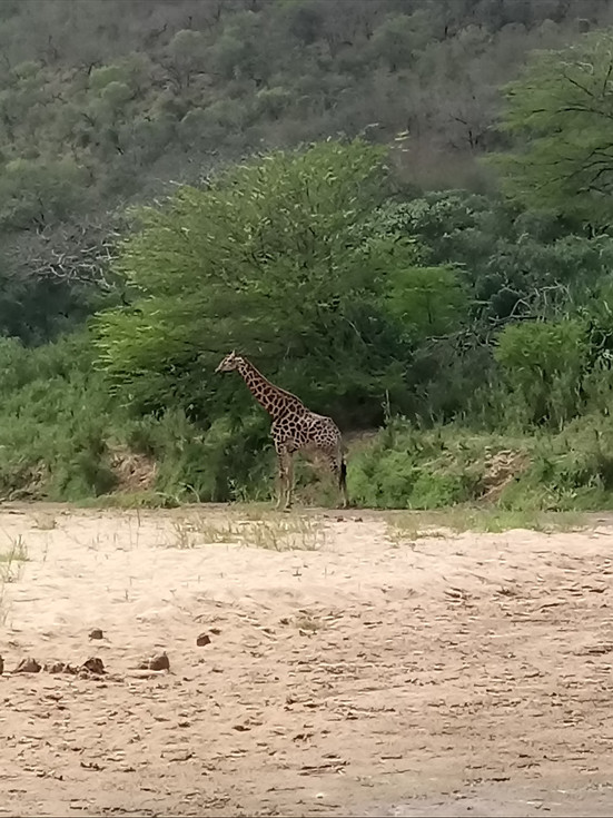 Ensuite au détour d’un virage qui débouche sur une rivière presque à sec on verra notre première girafe du voyage.