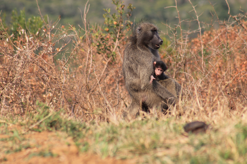 Puis on reprend la route , on s’arrête devant une famille de babouins et on craque sur la maman et son bébé qui s’accroche sur son ventre comme il peut.