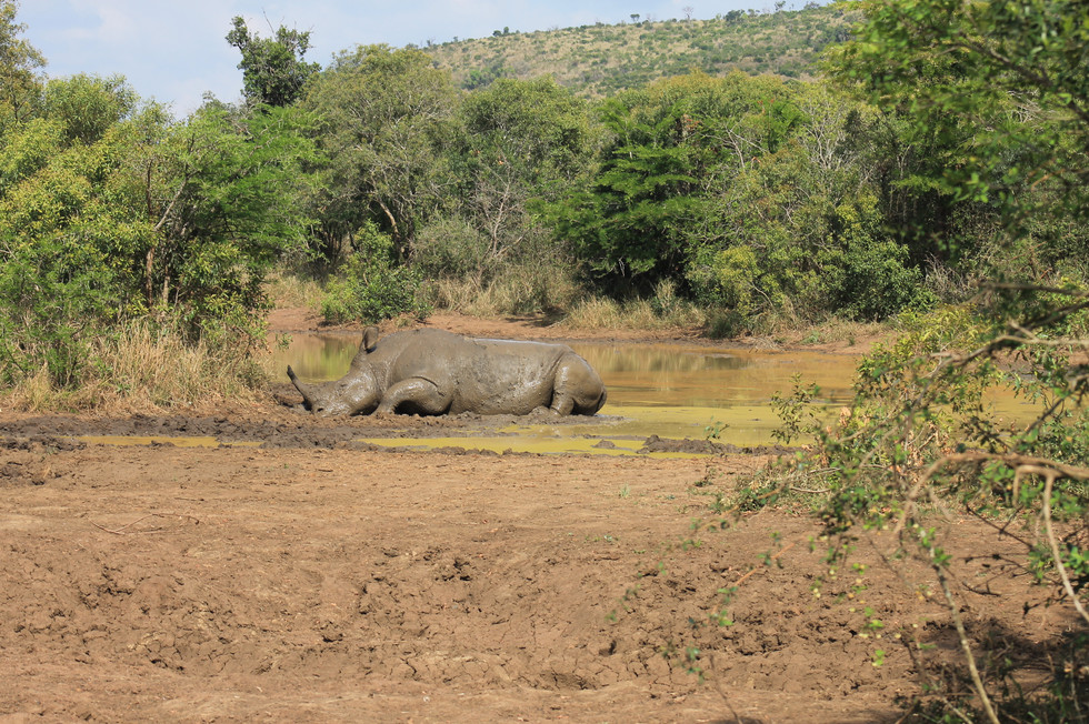 On roule beaucoup jusqu’à voir notre premier rhino qui se prend un bon bain de boue. On en croisera beaucoup dans le parc.