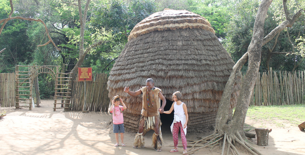 Il a fallu ranger toutes les affaires de camping et c’est là que tu dis que c’est quand même plus facile de les monter que de les démonter. En quittant le camping on passe devant l’entrée d’un lodge qui est juste à côté, il y a un homme en costume traditionnel devant une hutte. Il vient nous voir car on s’arrête. Il dit bonjour aux enfants et leur dit de venir pour prendre une photo devant la hutte, il fait également quelques pas de danse en chantant.