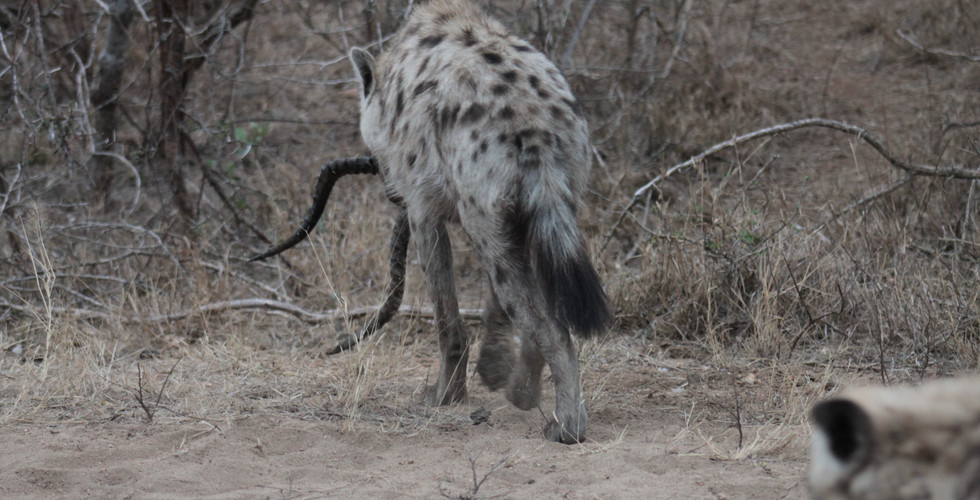 Levé à 5h20, ouch c’est dur. Mais pour une fois on est dans le parc à 6h dès l’ouverture. On fait 2 km et on voit plein de voiture arrêtée. Plusieurs hyènes étaient là qui revenaient de leur nuit de chasse dont une qui avait des cornes d’impalas dans la gueule.