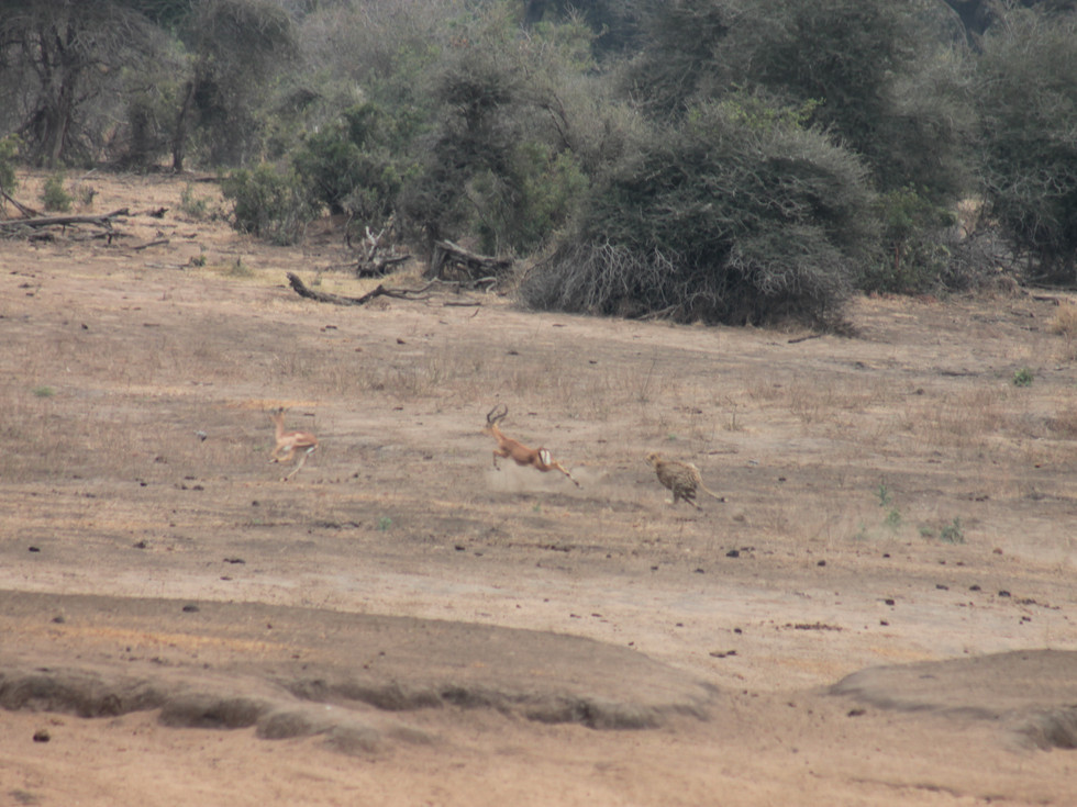 Ils sont aux aguets car les points d’eau sont des endroits dangereux pour eux. 2 impalas de rapprochent des guépards sans les voir et quand ils arrivent à 10 mètres l’attaque commence et ça va vite. Un des guépard s’élance derrière l’imapla et le deuxième est un peu en retrait.